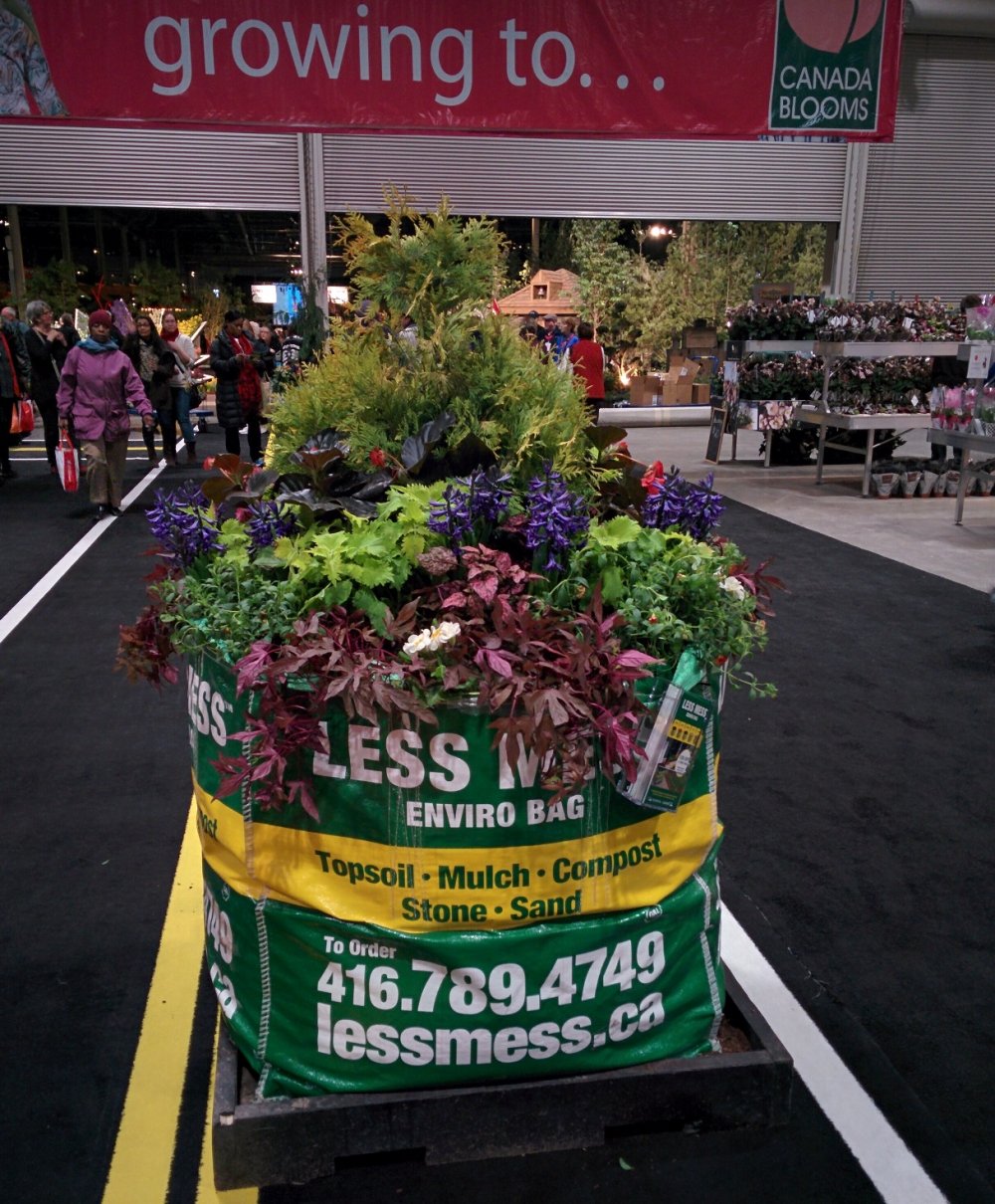 Earthco’s residential sub-brand, Less Mess, had its mulch bags displayed throughout the show. Canada Blooms staff skillfully arranged colourful flowers and plants inside the 1 cubic yard Less Mess bags for eye-catching displays.