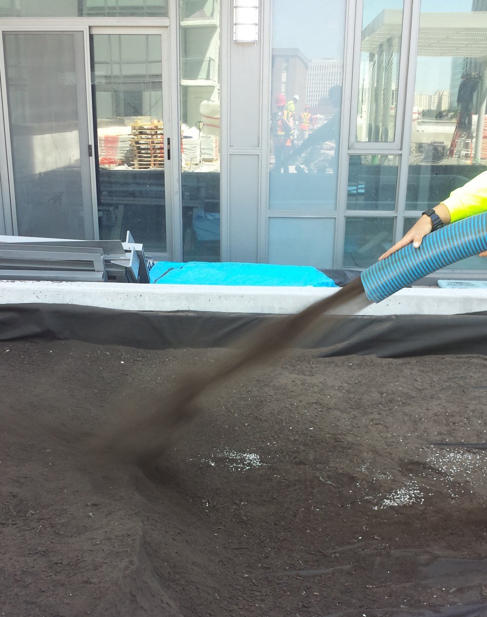 The hose “blows” the soil up to the 3rd floor where it is applied into the designated planter areas. A construction worker holds the end of the hose to make sure the soil is applied evenly. Click here to watch the YouTube video.